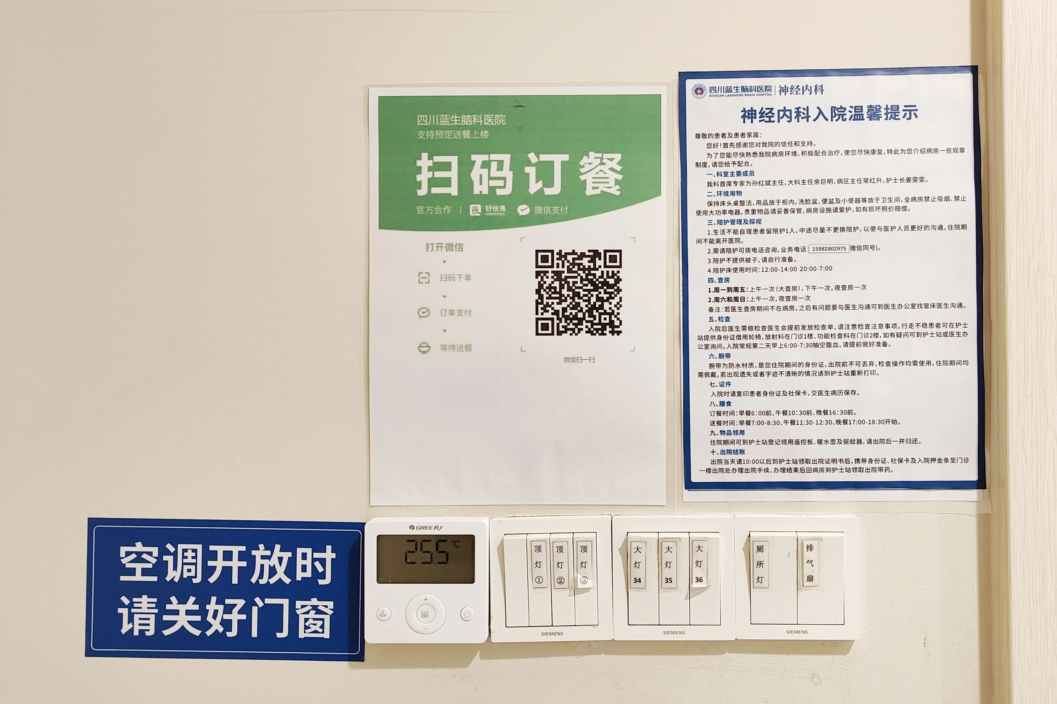 在四川藍生腦科醫(yī)院住院部的每間病房,都會看到一張帶有“掃碼訂餐”的二維碼,患者或家屬只需要用手機掃一掃,便可進入食堂訂餐頁面,選擇自己喜歡的飯菜,支付后即可送餐到床頭,如果患者不方便點餐或者不會操作,可以讓護士幫忙,也可以由家人保存二維碼后遠程點餐,方便快捷。