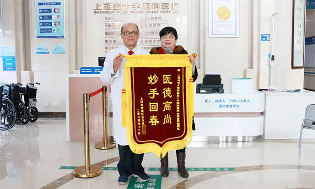 一位女士把一面題有“醫(yī)德高尚 妙手回春”的大錦旗送給了關(guān)桂春教授。