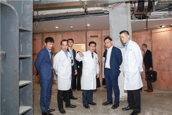 在建的腦復蘇中心與高壓氧艙室已初具規(guī)模,明亮整潔的腦復蘇中心與巨型的方型艙主體引起了專家們的注意。Prof.Dr.Tilo Kircher詳細了解設施設備,詢問建設進展情況。