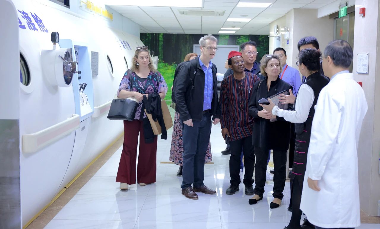 參觀過程中,專家代表對醫(yī)院業(yè)務(wù)開展、學(xué)科建設(shè)、特色醫(yī)療技術(shù)、設(shè)施設(shè)備等表現(xiàn)出濃厚的興趣,并進(jìn)行了現(xiàn)場交流。值得一提的是,在高壓氧科,規(guī)模宏大的氧艙群讓專家代表們眼前一亮,大家駐足良久,紛紛拿出手機(jī)拍照留念。
