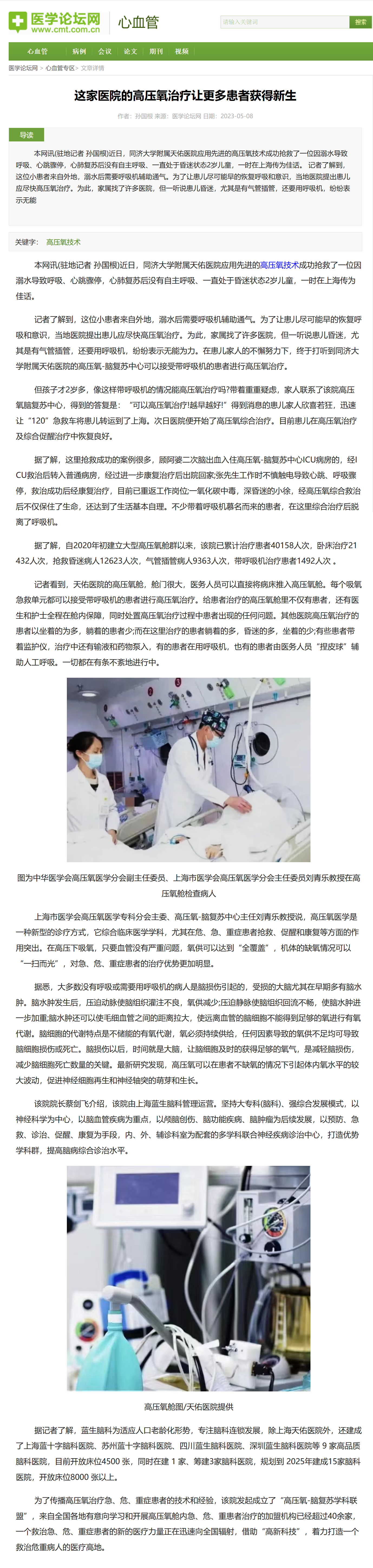 本網(wǎng)訊(駐地記者 孫國(guó)根)近日,同濟(jì)大學(xué)附屬天佑醫(yī)院應(yīng)用先進(jìn)的高壓氧技術(shù)成功搶救了一位因溺水導(dǎo)致呼吸、心跳驟停,心肺復(fù)蘇后沒(méi)有自主呼吸、一直處于昏迷狀態(tài)2歲兒童,一時(shí)在上海傳為佳話。 記者了解到,這位小患者來(lái)自外地,溺水后需要呼吸機(jī)輔助通氣。為了讓患兒盡可能早的恢復(fù)呼吸和意識(shí),當(dāng)?shù)蒯t(yī)院提出患兒應(yīng)盡快高壓氧治療。