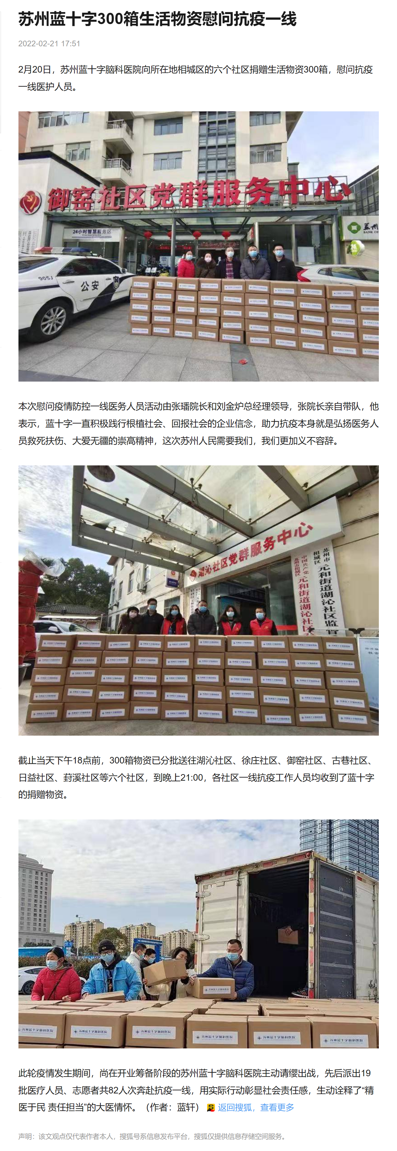 2月20日,蘇州藍(lán)十字腦科醫(yī)院向所在地相城區(qū)的六個(gè)社區(qū)捐贈(zèng)生活物資300箱,慰問(wèn)抗疫一線醫(yī)護(hù)人員。