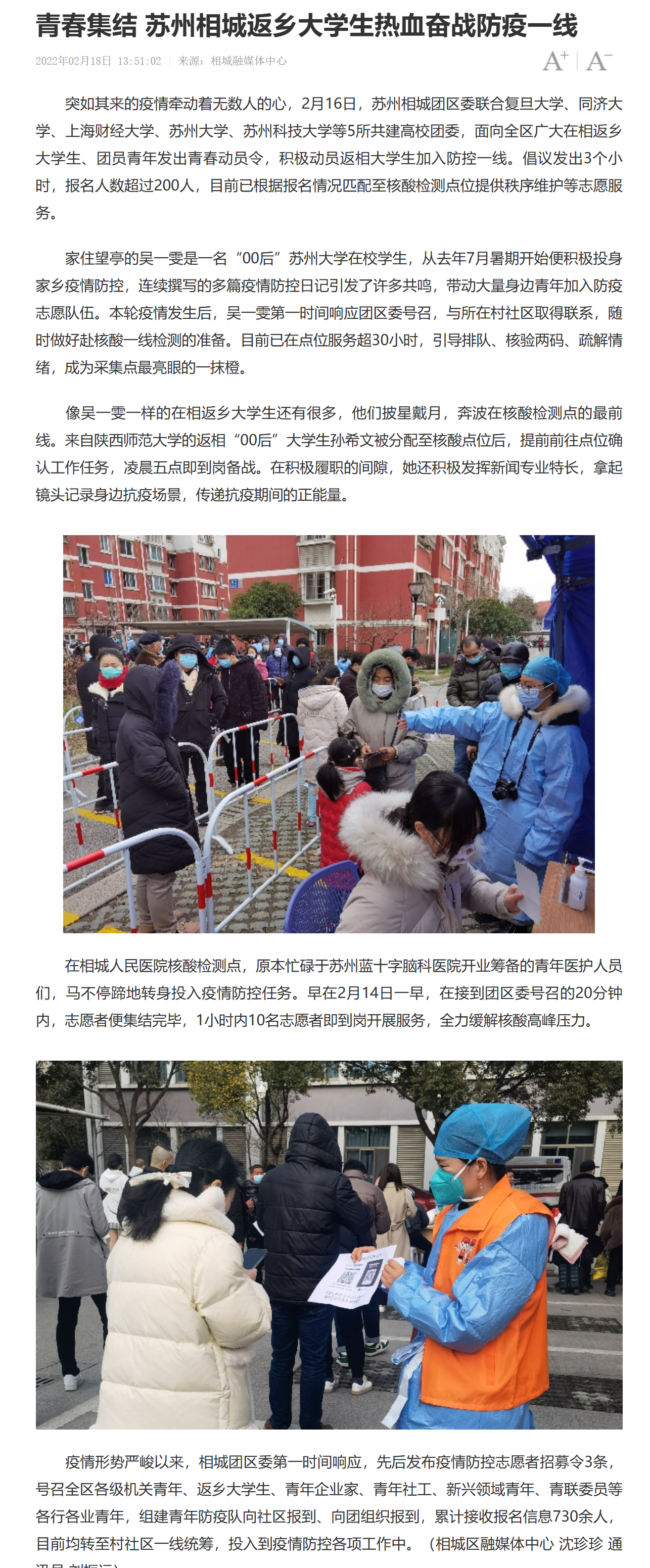 突如其來的疫情牽動著無數(shù)人的心,2月16日,蘇州相城團區(qū)委聯(lián)合復(fù)旦大學(xué)、同濟大學(xué)、上海財經(jīng)大學(xué)、蘇州大學(xué)、蘇州科技大學(xué)等5所共建高校團委,面向全區(qū)廣大在相返鄉(xiāng)大學(xué)生、團員青年發(fā)出青春動員令,積極動員返相大學(xué)生加入防控一線。倡議發(fā)出3個小時,報名人數(shù)超過200人,目前已根據(jù)報名情況匹配至核酸檢測點位提供秩序維護等志愿服務(wù)。