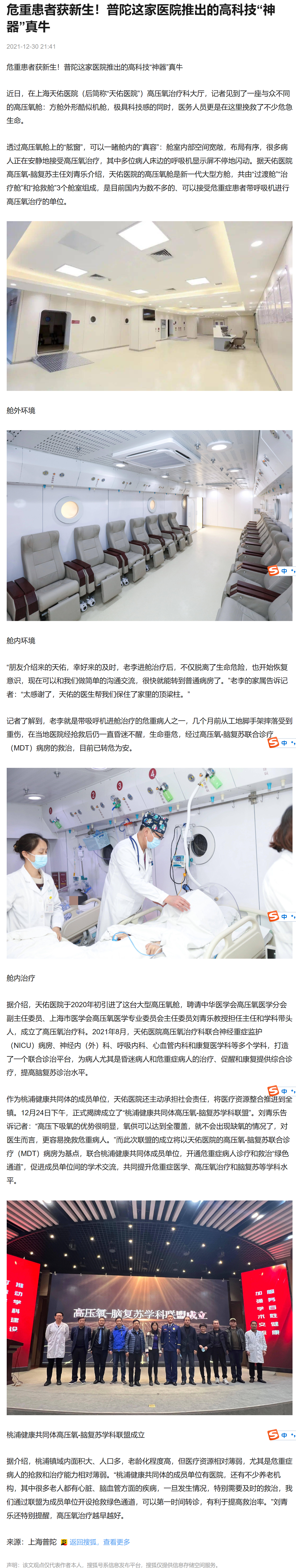 據(jù)介紹,天佑醫(yī)院于2020年初引進(jìn)了這臺大型高壓氧艙,聘請中華醫(yī)學(xué)會高壓氧醫(yī)學(xué)分會副主任委員、上海市醫(yī)學(xué)會高壓氧醫(yī)學(xué)專業(yè)委員會主任委員劉青樂教授擔(dān)任主任和學(xué)科帶頭人,成立了高壓氧治療科。2021年8月,天佑醫(yī)院高壓氧治療科聯(lián)合神經(jīng)重癥監(jiān)護(hù)(NICU)病房、神經(jīng)內(nèi)(外)科、呼吸內(nèi)科、心血管內(nèi)科和康復(fù)醫(yī)學(xué)科等多個學(xué)科,打造了一個聯(lián)合診治平臺,為病人尤其是昏迷病人和危重癥病人的治療、促醒和康復(fù)提供綜合診療,提高腦復(fù)蘇診治水平。