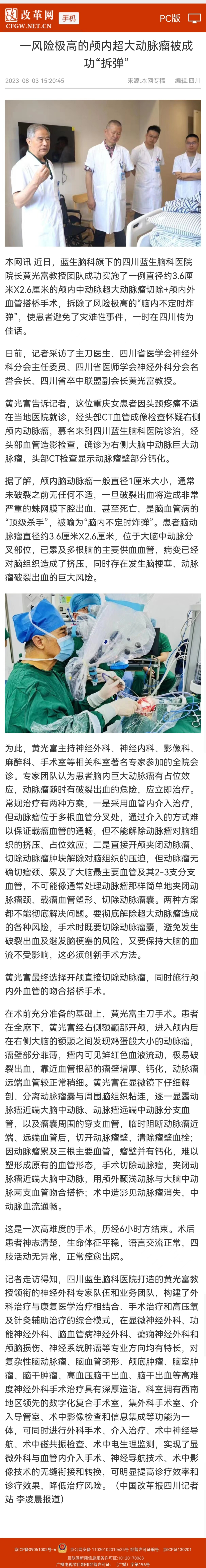 本網(wǎng)訊 近日,藍生腦科旗下的四川藍生腦科醫(yī)院院長黃光富教授團隊成功實施了一例直徑約3.6厘米X2.6厘米的顱內(nèi)中動脈超大動脈瘤切除+顱內(nèi)外血管搭橋手術(shù),拆除了風(fēng)險極高的“腦內(nèi)不定時炸彈”,使患者避免了災(zāi)難性事件,一時在四川傳為佳話。
