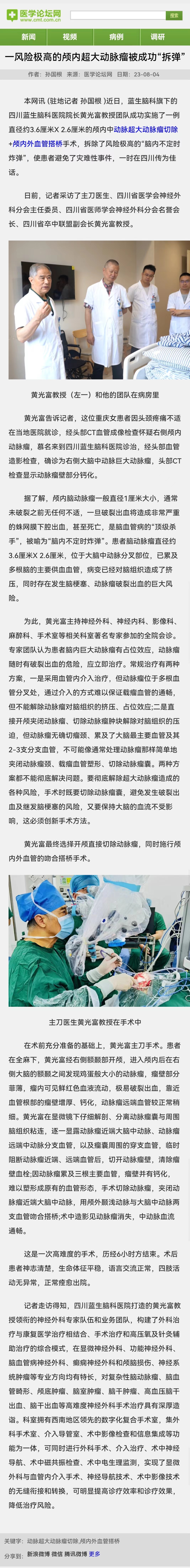 本網(wǎng)訊 (駐地記者 孫國根 )近日,藍生腦科旗下的四川藍生腦科醫(yī)院院長黃光富教授團隊成功實施了一例直徑約3.6厘米X 2.6厘米的顱內(nèi)中動脈超大動脈瘤切除+顱內(nèi)外血管搭橋手術(shù),拆除了風(fēng)險極高的“腦內(nèi)不定時炸彈”,使患者避免了災(zāi)難性事件,一時在四川傳為佳話。