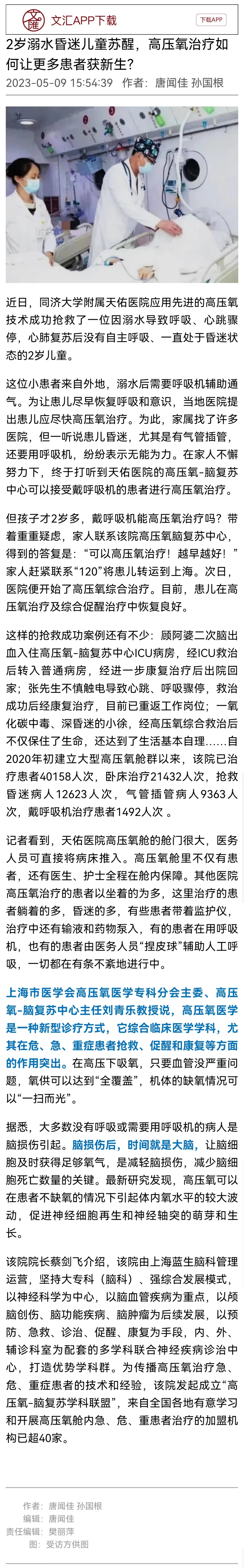 近日,同濟(jì)大學(xué)附屬天佑醫(yī)院應(yīng)用先進(jìn)的高壓氧技術(shù)成功搶救了一位因溺水導(dǎo)致呼吸、心跳驟停,心肺復(fù)蘇后沒(méi)有自主呼吸、一直處于昏迷狀態(tài)的2歲兒童。