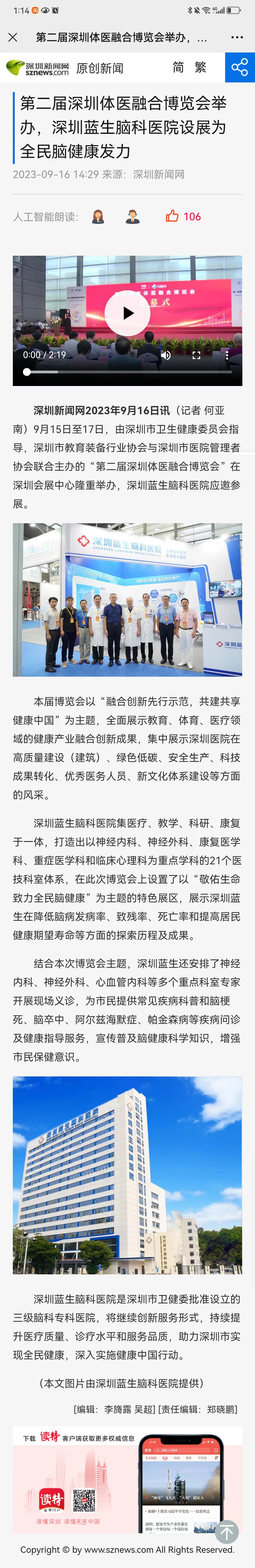 深圳新聞網(wǎng)2023年9月16日訊(記者 何亞南)9月15日至17日,由深圳市衛(wèi)生健康委員會(huì)指導(dǎo),深圳市教育裝備行業(yè)協(xié)會(huì)與深圳市醫(yī)院管理者協(xié)會(huì)聯(lián)合主辦的“第二屆深圳體醫(yī)融合博覽會(huì)”在深圳會(huì)展中心隆重舉辦,深圳藍(lán)生腦科醫(yī)院應(yīng)邀參展。