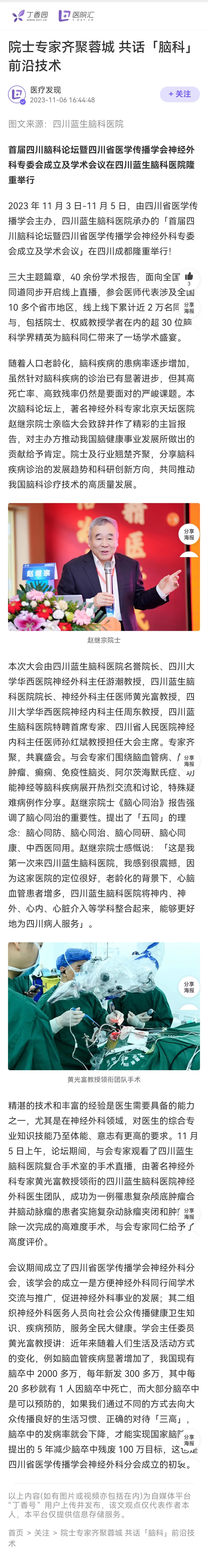 2023 年 11 月 3 日-11 月 5 日,由四川省醫(yī)學(xué)傳播學(xué)會主辦,四川藍生腦科醫(yī)院承辦的「首屆四川腦科論壇暨四川省醫(yī)學(xué)傳播學(xué)會神經(jīng)外科專委會成立及學(xué)術(shù)會議」在四川成都隆重舉行!