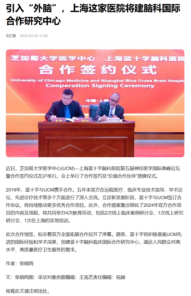 近日,芝加哥大學(xué)醫(yī)學(xué)中心(UCM)—上海藍(lán)十字腦科醫(yī)院第五屆神經(jīng)醫(yī)學(xué)國(guó)際高峰論壇暨合作簽約儀式在滬舉行。會(huì)上舉行了合作簽約及“價(jià)值合作伙伴”授牌儀式。