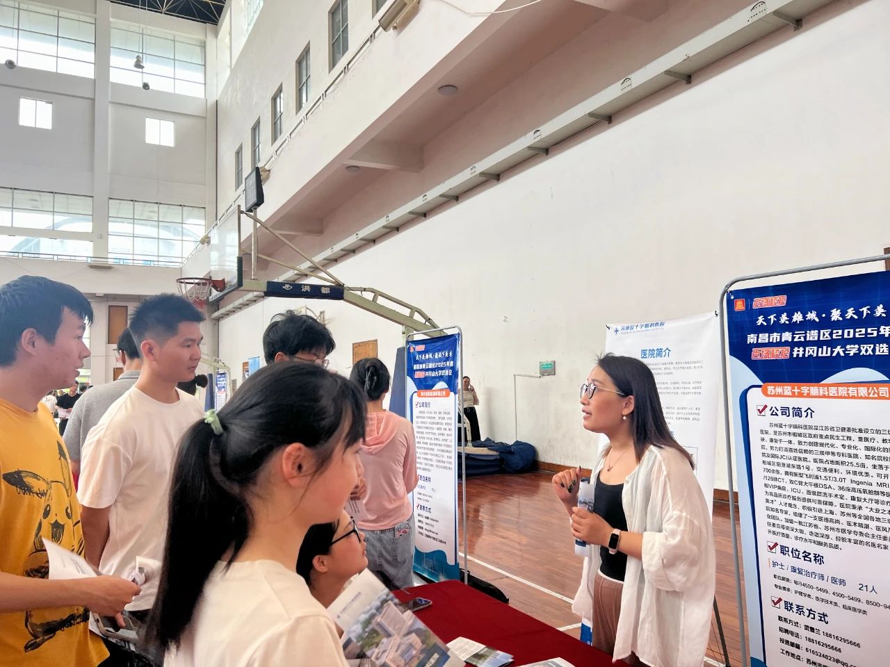 △ 井岡山大學(xué)黨委常委、副校長冷明(中)與醫(yī)院代表在招聘會(huì)會(huì)面