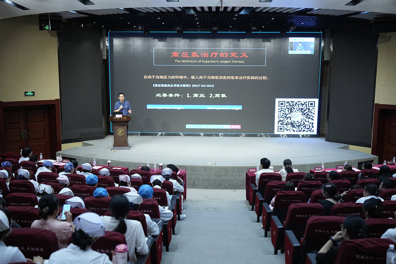 開(kāi)班式后,中華醫(yī)學(xué)會(huì)高壓氧醫(yī)學(xué)分會(huì)副主任委員、上海天佑醫(yī)院高壓氧腦復(fù)蘇中心主任劉青樂(lè)教授帶來(lái)了《高壓氧技術(shù)在危重癥患者治療中的應(yīng)用進(jìn)展》專題講座,系統(tǒng)講解了高壓氧治療的定義、高壓氧對(duì)機(jī)體的作用、高壓氧治療的安全性及相對(duì)禁忌癥等,強(qiáng)調(diào)通過(guò)技術(shù)創(chuàng)新可以突破高壓氧治療的“禁忌”,幫助危重癥患者在高壓氧艙內(nèi)轉(zhuǎn)危為安。