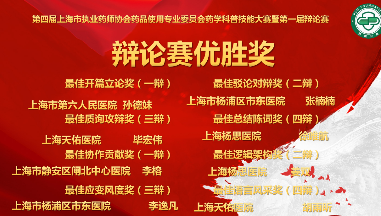 10月27日,由上海市執(zhí)業(yè)藥師協會藥品使用專業(yè)委員會與PSM(藥品安全合作聯盟)上海站聯合舉辦的“第四屆藥學科普技能大賽暨第一屆‘藥青春·藥思辨’藥學服務辯論大賽”成功舉辦。