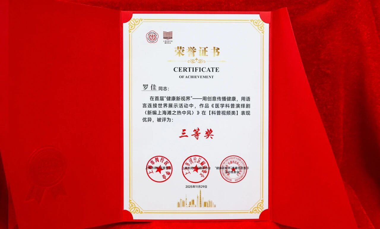 在上海市閔行區(qū)醫(yī)學會、上海市閔行區(qū)翻譯協(xié)會等五家單位聯合主辦的首屆“健康新視界”傳播創(chuàng)意展示活動中,醫(yī)院選送的醫(yī)學科普演繹劇《新編上海灘之熱中風》在【科普短視頻/新媒體推廣/病歷譯寫】賽道中榮獲三等獎。醫(yī)院因積極參與活動,被組委會授予優(yōu)秀組織獎。