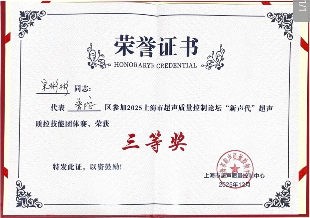 近日,從上海市超聲醫(yī)學(xué)質(zhì)量控制中心主辦的“2025年上海市超聲質(zhì)量控制中心年會暨‘新聲代’超聲質(zhì)控技能團(tuán)體賽”大會上獲悉:上海天佑醫(yī)院與同濟(jì)醫(yī)院、普陀區(qū)中心醫(yī)院聯(lián)合代表隊(duì)榮獲團(tuán)體三等獎(jiǎng),天佑醫(yī)院超聲科宋彬彬主治醫(yī)師榮獲個(gè)人三等獎(jiǎng)。