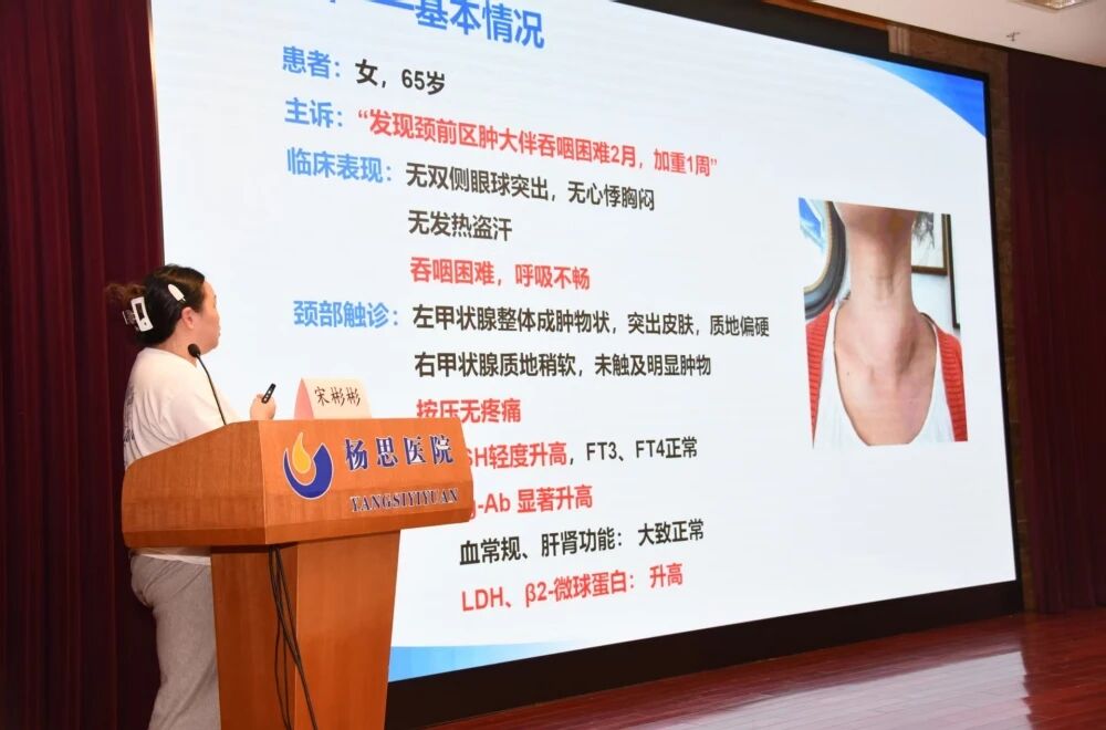 此報(bào)告詳述了一例65歲女性診療全程,從主訴、查體、檢查入手,最終經(jīng)病理確診為易混淆的“原發(fā)性甲狀腺M(fèi)ALT淋巴瘤伴部分大B細(xì)胞轉(zhuǎn)化”。報(bào)告歸納了該病“好發(fā)于中老年女性、表現(xiàn)為快速無痛性頸部腫物”的核心特征,并通過對比癥狀與超聲影像,理清了與橋本氏甲狀腺炎等疾病的鑒別要點(diǎn)。
