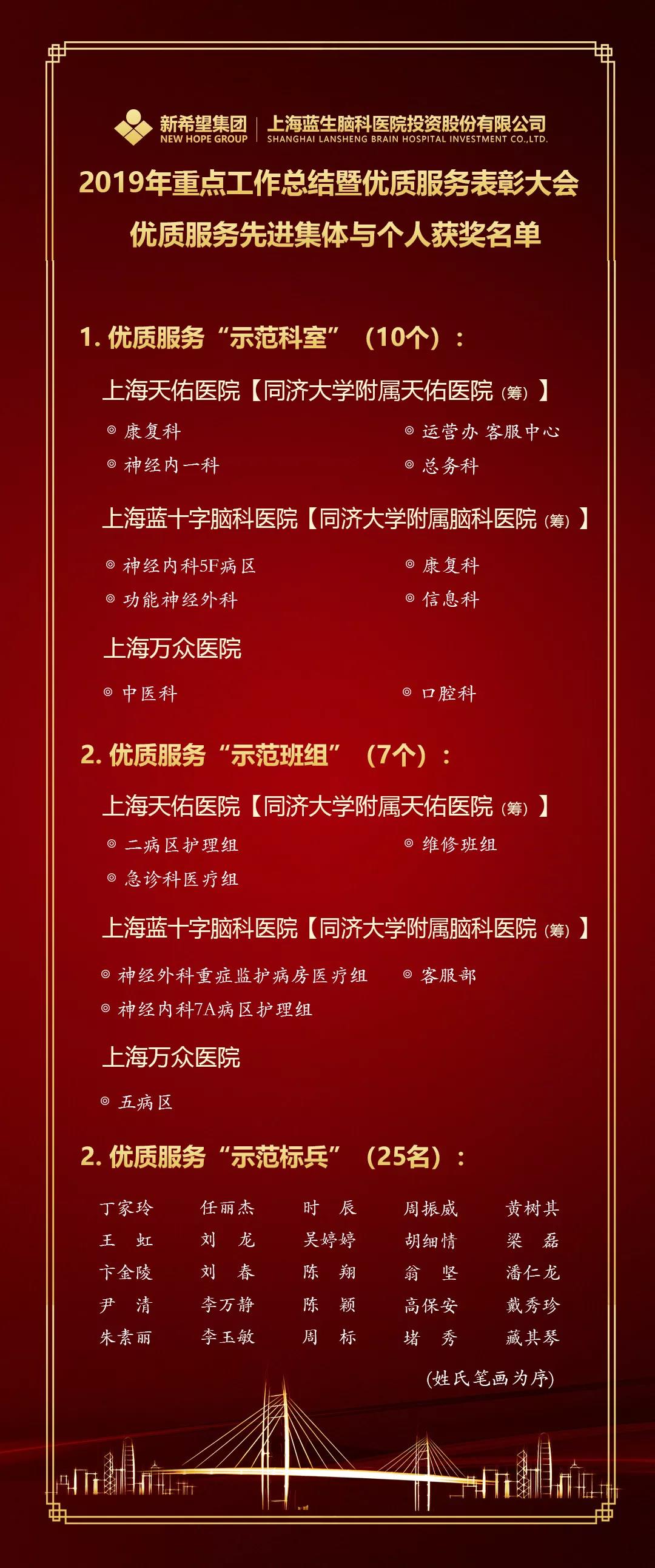 公司副總裁黃曉梅宣讀表彰決定:授予“上海天佑醫(yī)院運(yùn)營(yíng)辦和客服中心”等10個(gè)科室為優(yōu)質(zhì)服務(wù)“示范科室”;授予“上海藍(lán)十字腦科醫(yī)院神經(jīng)外科重癥監(jiān)護(hù)室醫(yī)療組”等7個(gè)班組為優(yōu)質(zhì)服務(wù)“示范班組”;授予上海萬(wàn)眾醫(yī)院高保安等25位同志為優(yōu)質(zhì)服務(wù)“示范標(biāo)兵”。受表彰的先進(jìn)集體和先進(jìn)個(gè)人,在本職工作中做出了突出業(yè)績(jī),踐行了公司倡導(dǎo)的“德信為本、精醫(yī)于民、責(zé)任擔(dān)當(dāng)、追求卓越”的工作精神,是2300多醫(yī)務(wù)員工的優(yōu)秀代表,是全體干部員工學(xué)習(xí)的楷模。