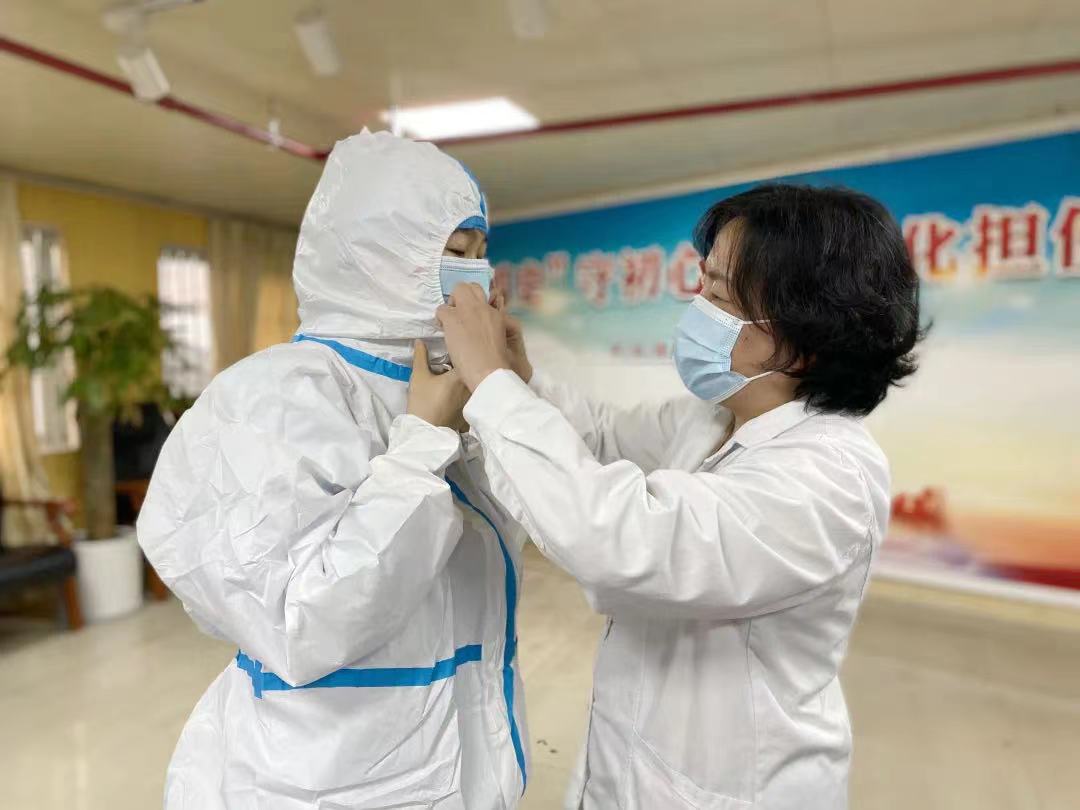 四病區(qū)護(hù)士長(zhǎng)于如如現(xiàn)場(chǎng)指導(dǎo)示范穿戴防護(hù)服和消毒隔離的正確操作,通過結(jié)合視頻課件和實(shí)操培訓(xùn),隊(duì)員們逐一通過考核并完成采樣崗前防控培訓(xùn)。