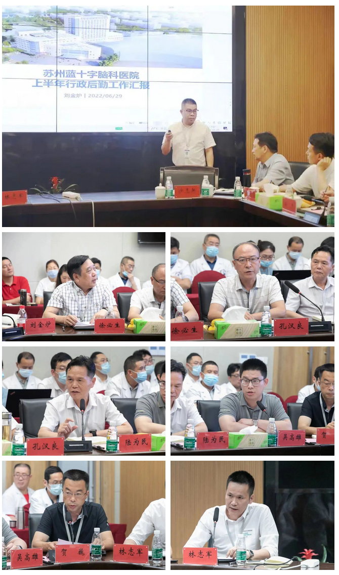 蘇州藍(lán)十字腦科醫(yī)院張璠院長、劉金爐總經(jīng)理分別圍繞抗疫工作、執(zhí)業(yè)許可、學(xué)科構(gòu)建、業(yè)務(wù)工作、醫(yī)保工作、黨建工作和行政管理、人事招聘、財務(wù)管控、物資采購、信息建設(shè)、后勤保障、工程驗收、開業(yè)準(zhǔn)備作工作匯報。副院長徐必生、孔漢良,副總經(jīng)理陸為民、吳高雄、賀巍和總經(jīng)理助理林志軍分別圍繞分管工作作匯報。