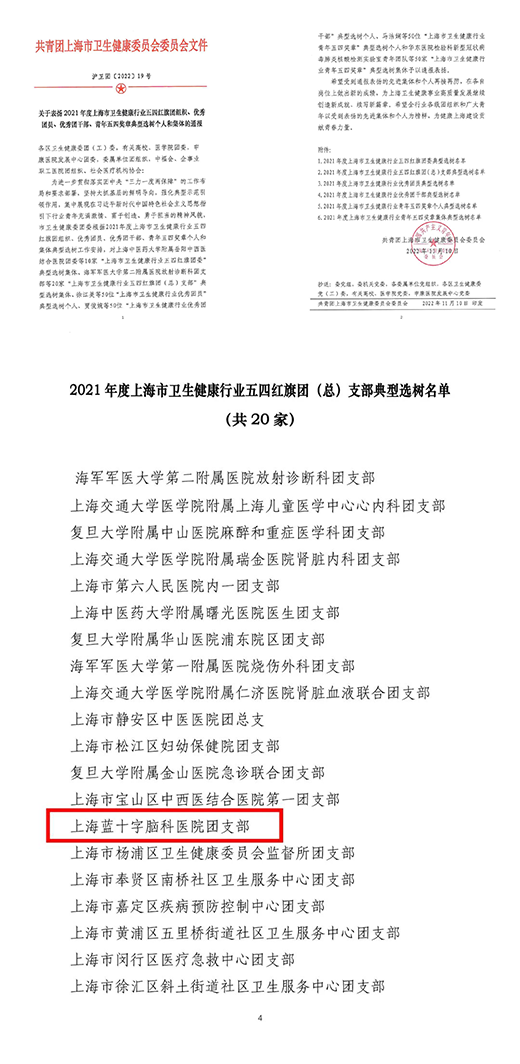 11月10日,上海市衛(wèi)生健康委團(tuán)委通報(bào)表揚(yáng)2021年度上海市衛(wèi)生健康行業(yè)五四紅旗團(tuán)組織、優(yōu)秀團(tuán)員、優(yōu)秀團(tuán)干部、青年五四獎(jiǎng)?wù)碌湫瓦x樹個(gè)人和集體。上海藍(lán)十字腦科醫(yī)院團(tuán)支部獲評(píng)2021年度上海市衛(wèi)生健康行業(yè)五四紅旗團(tuán)(總)支部典型選樹集體。