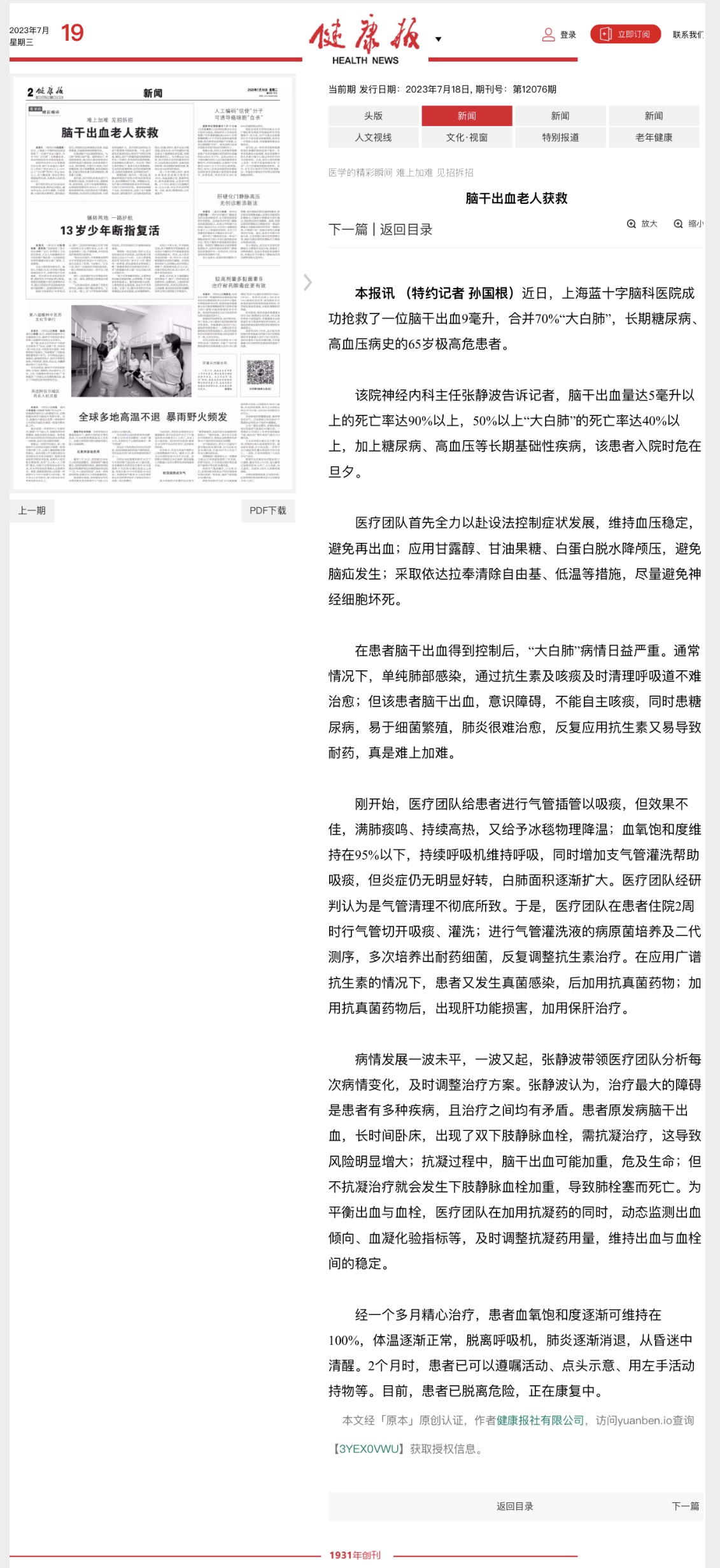 近日,上海藍十字腦科醫(yī)院成功搶救了一位腦干出血9毫升,合并70%“大白肺”長期糖尿病、高血壓病史的65歲極高?;颊?。