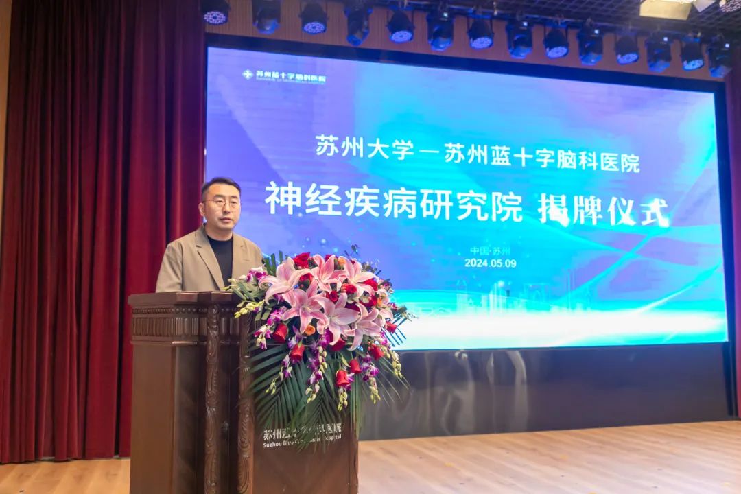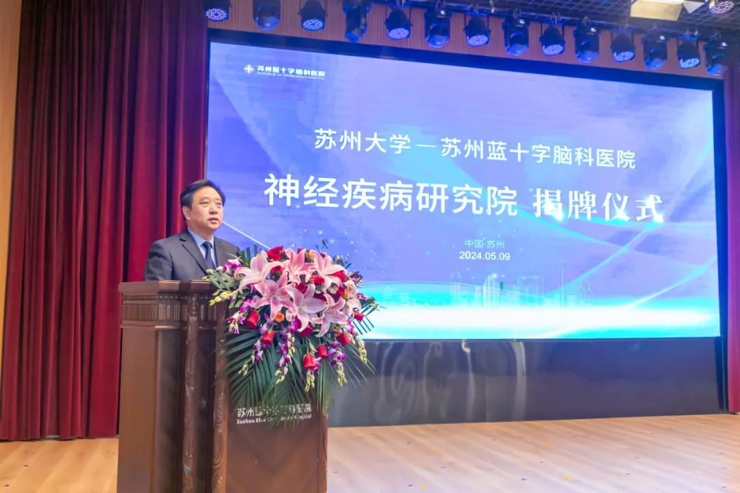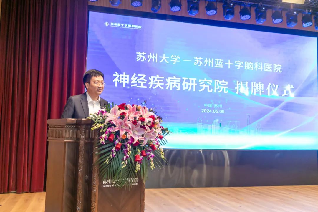 2024年5月9日上午,惠風(fēng)和暢,蓓蕾初放,蘇州大學(xué)-蘇州藍(lán)十字腦科醫(yī)院神經(jīng)疾病研究院揭牌儀式于蘇州藍(lán)十字腦科醫(yī)院舉行。蘇州大學(xué)科技黨委書(shū)記徐小樂(lè)、蘇州市相城區(qū)衛(wèi)健委主任孫偉為、蘇州大學(xué)神經(jīng)科學(xué)研究所副所長(zhǎng)劉耀波、公司總經(jīng)理劉軼永、蘇州藍(lán)十字腦科醫(yī)院院長(zhǎng)徐必生出席儀式并致辭。