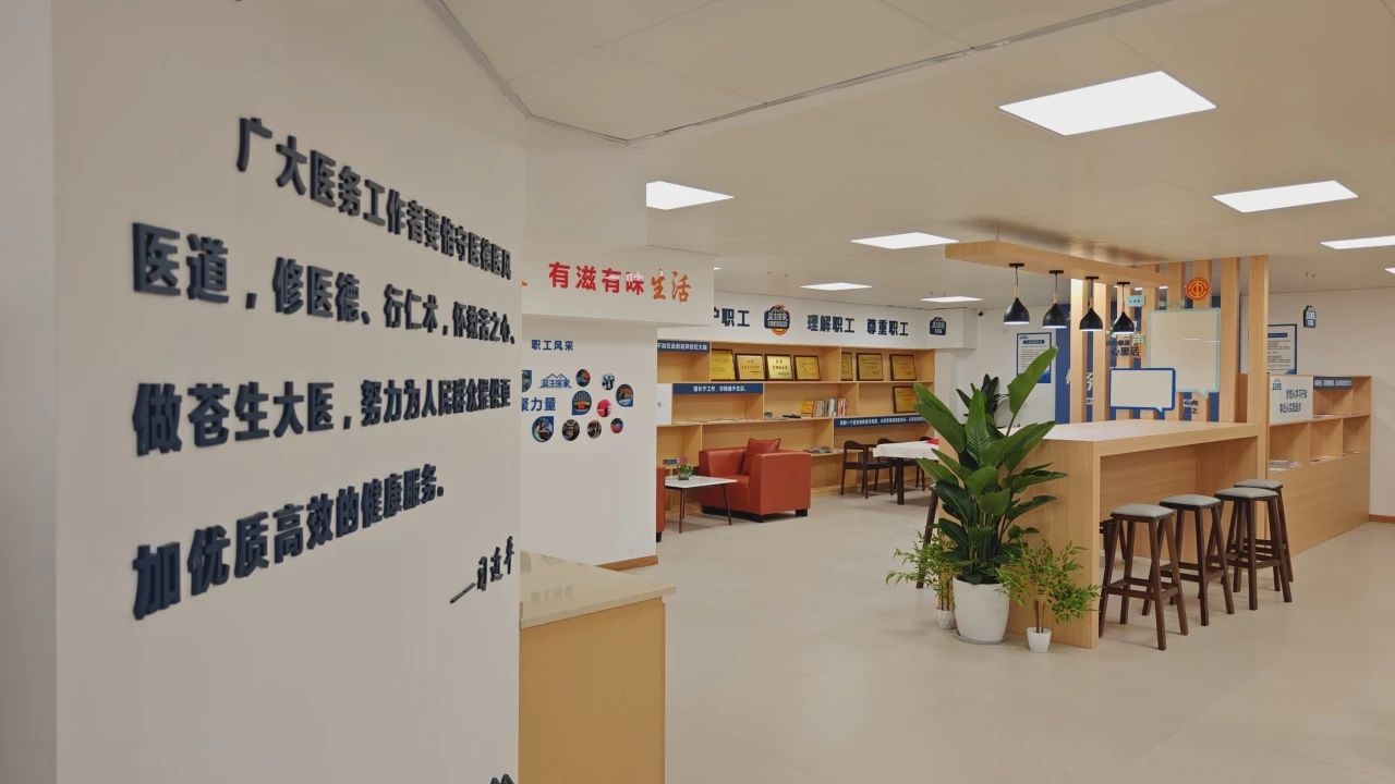 職工之家位于醫(yī)院4號(hào)樓六樓,設(shè)計(jì)巧妙融合了現(xiàn)代簡(jiǎn)約與傳統(tǒng)美學(xué),為職工打造了一個(gè)集休息、學(xué)習(xí)、交流與放松于一體的全方位多功能空間。這里設(shè)有舒適的休閑區(qū),供職工放松疲憊身心;運(yùn)動(dòng)區(qū)配備了齊全的健身設(shè)施,鼓勵(lì)職工保持活力與健康;溫馨的閱讀角則提供了豐富的醫(yī)學(xué)書(shū)籍與人文讀物,滋養(yǎng)心靈,拓寬視野。