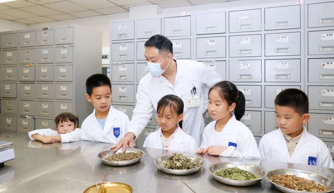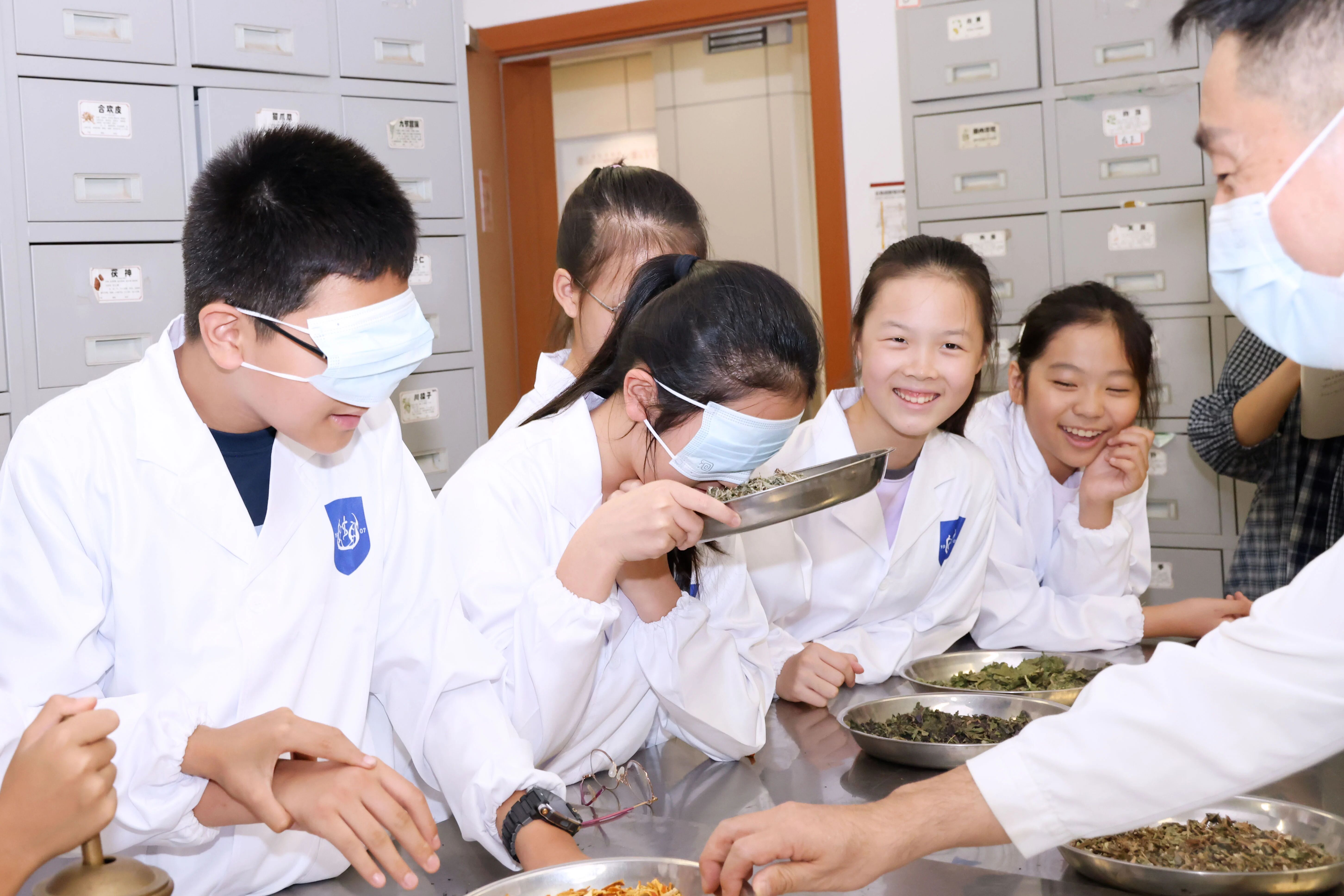 田藥師以提問的方式與孩子們互動,“小朋友們,你們知道這些藥材叫什么名字嗎?”田藥師剛拋出問題,小醫(yī)生們就爭先恐后地搶答起來,“這個黃色的是陳皮,媽媽煲湯時會放!”“這個聞起來清清涼涼,一定是薄荷!”童言稚語此起彼伏,熱鬧極了。