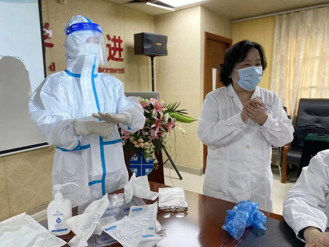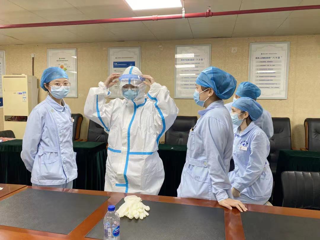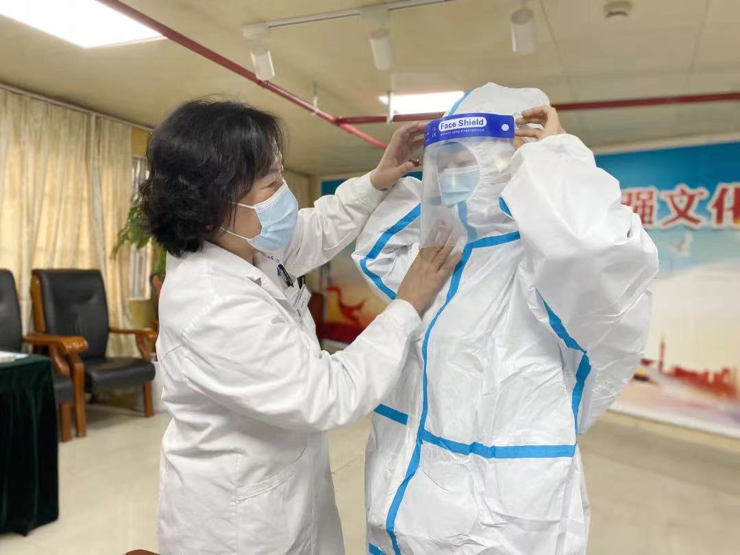 四病區(qū)護(hù)士長于如如現(xiàn)場指導(dǎo)示范穿戴防護(hù)服和消毒隔離的正確操作,通過結(jié)合視頻課件和實(shí)操培訓(xùn),隊(duì)員們逐一通過考核并完成采樣崗前防控培訓(xùn)。